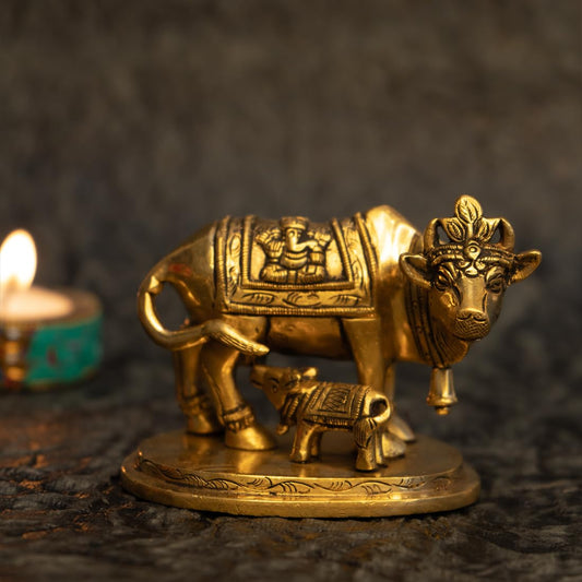 100% Brass Kamdhenu Cow | Nandi Idol for Pooja | Nandi Cow Show Pieces for Home Decor | Gai Vasru Murti for Vaastu and Feng Shui | Ideal Gift for Housewarming (Set of 2)