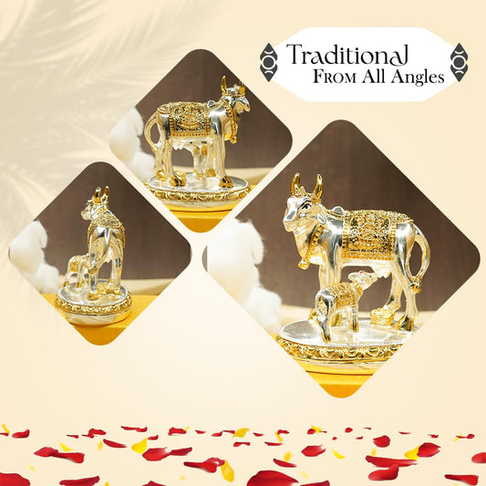 Kamdhenu Cow with Calf Vastu Idol | Gomatha Cow and Calf Statue for Pooja | Silver Cow Calf Idol for Home Decor, Vastu, Feng Shui, Pooja Room, Good Luck, Gift for Griha Pravesh Ceremony
