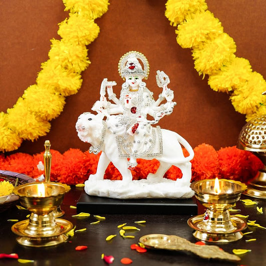 Aura Series Marble Dust Durga Maa Idol (8 inch, Medium Size) | Gemstone Zircon Studded Durga MATA Murti for Home Decor, Puja | Resin MATA Rani Murti | Maa Durga Murti